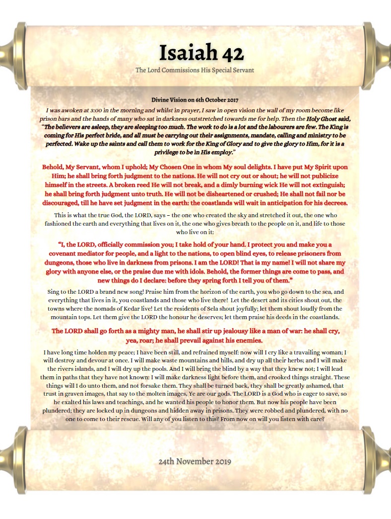 You must prophesy about nations now, saith God to you. You must prophesy about nations now. Your commission has began concerning nations, for you have been found faithful concerning the nation of America, and now you will see concerning other nations and you must announce God’s purposes and plans boldly, without compromise.